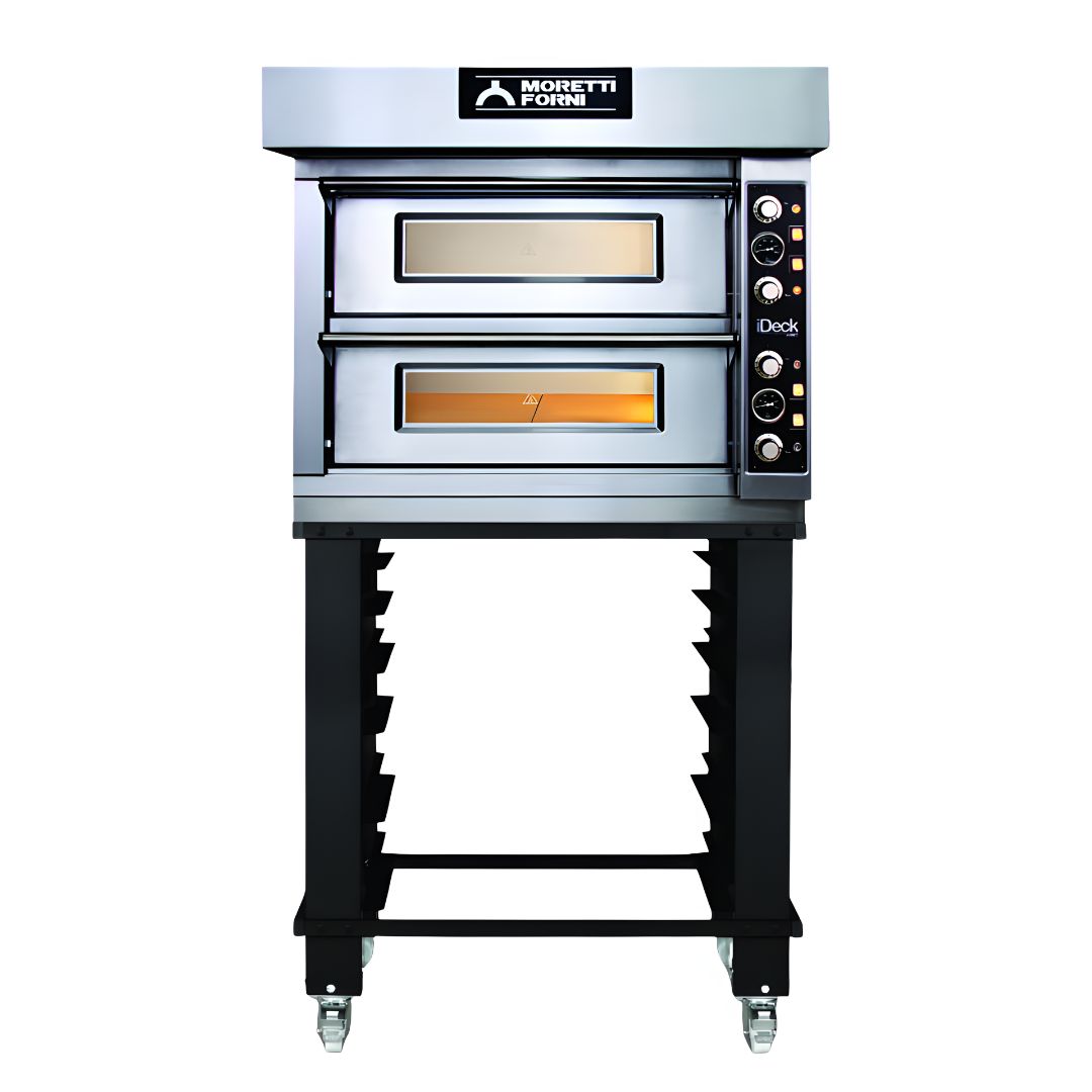 El horno eléctrico Moretti Forni iDECK-7272 es una opción profesional de doble cámara (deck) ideal para pizzerías, panaderías y negocios de productos leudados. Fabricado en Italia, destaca por su construcción robusta en acero inoxidable y su superficie de cocción en ladrillo refractario, que garantiza una distribución uniforme del calor y una cocción óptima. Su diseño compacto y elegante lo convierte en una elección atractiva para espacios de cocina exigentes. Además, ofrece un control digital preciso de la temperatura del techo y la base, permitiendo ajustes finos según las necesidades de cocción.