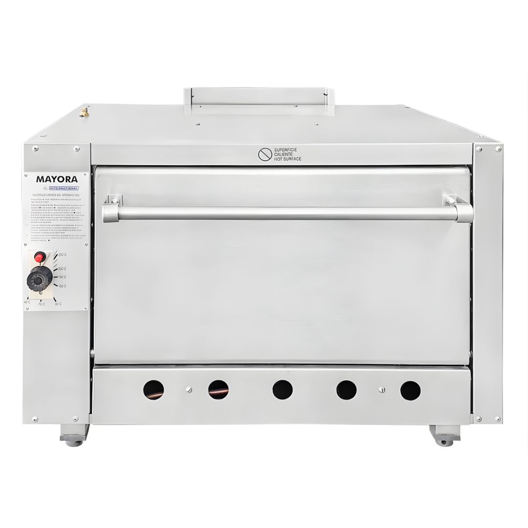 El horno profesional HM-1 es ideal para un uso continuo en cocinas comerciales. Su control de temperatura va desde 40°C a 250°C y cuenta con un sistema de válvula de seguridad. Funciona con gas L.P. o gas natural y tiene un quemador tipo H de fundición con 35,000 BTU. Es fácil de usar gracias a su encendido piezoeléctrico y su interior porcelanizado facilita la cocción eficiente de los alimentos.