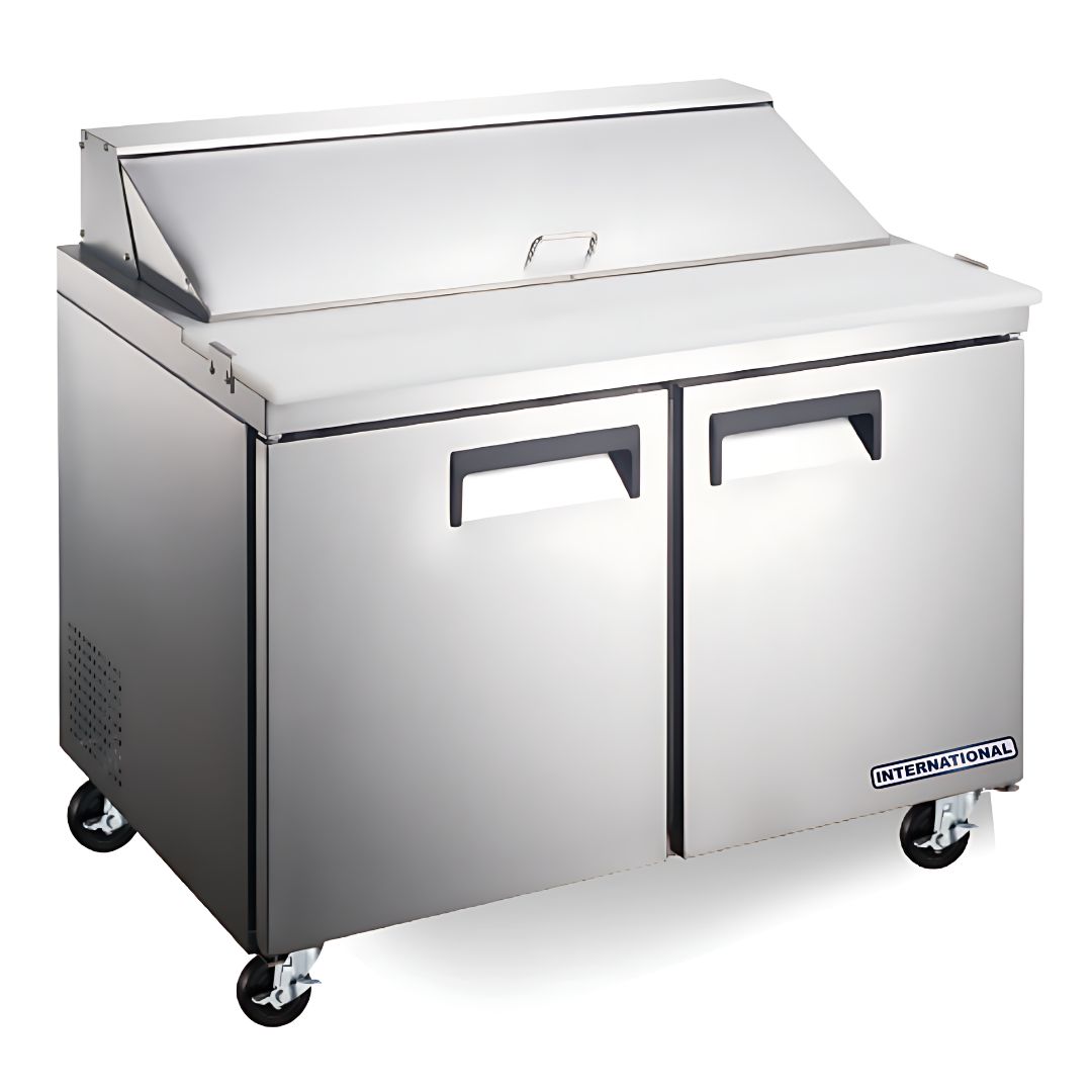 La mesa de preparación de sandwiches/ensaladas INT/MPE-2P-AI está fabricada con materiales de alta calidad: acero inoxidable en el interior y exterior, con una parte trasera de aluminio. El sistema de refrigeración mantiene los alimentos en un rango seguro entre 0,5°C y 5°C (33°F y 41°F), asegurando la frescura de los productos. Las puertas tienen autocierre y bloqueo de 90 grados para mayor seguridad y eficiencia. Incluye estantes ajustables recubiertos de PVC de alta resistencia y un sistema electrónico de control para ajustar la temperatura y la frecuencia de descongelamiento. Las ruedas preinstaladas con freno facilitan el movimiento. Además, su diseño permite un fácil acceso al serpentín del condensador para el mantenimiento.