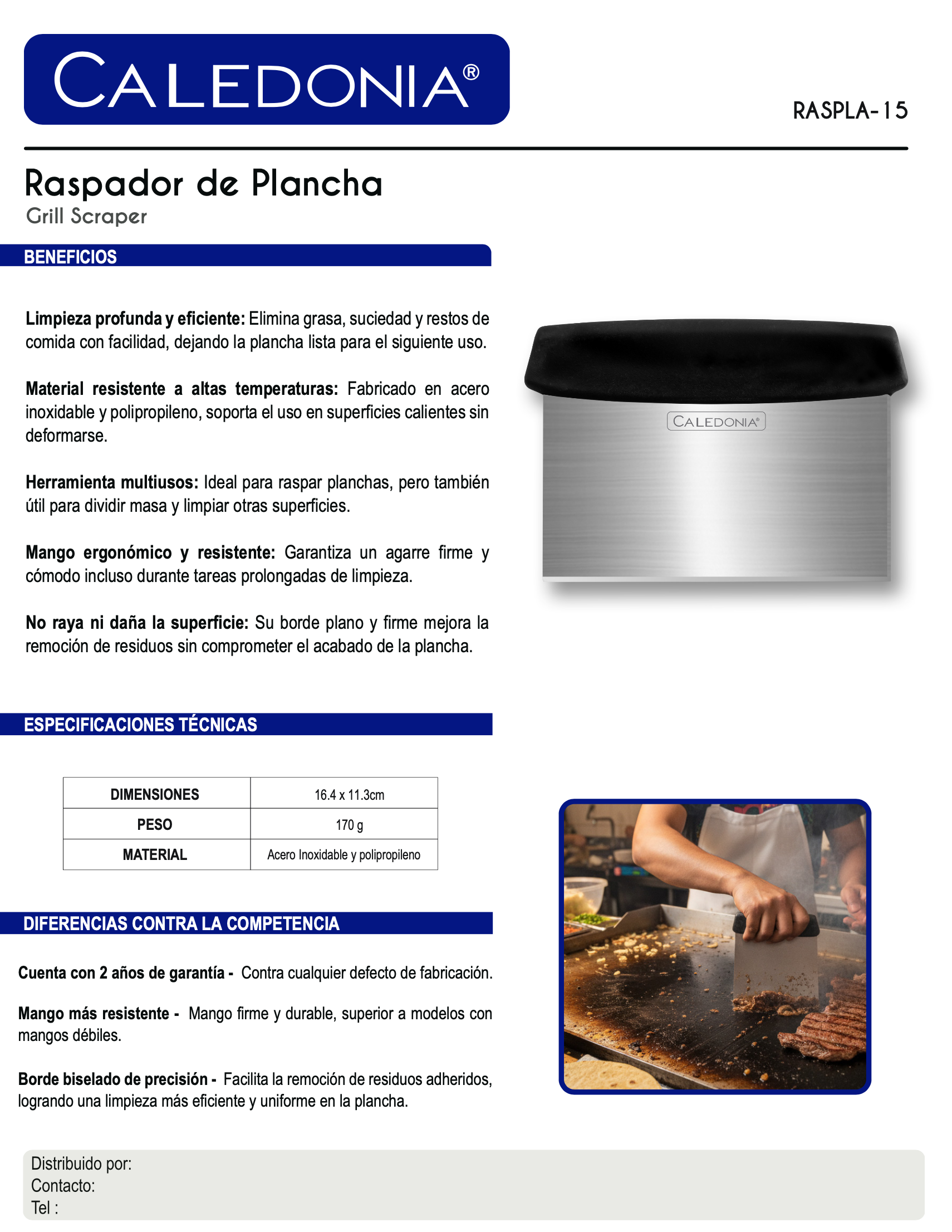 El Raspador de Plancha RASPLA-15 Caledonia es una herramienta profesional diseñada para realizar una limpieza eficiente y precisa en planchas y superficies calientes. Su combinación de acero inoxidable y polipropileno de alta resistencia permite remover residuos adheridos sin deformarse, ofreciendo durabilidad y un desempeño confiable en cocinas de alto ritmo de trabajo.