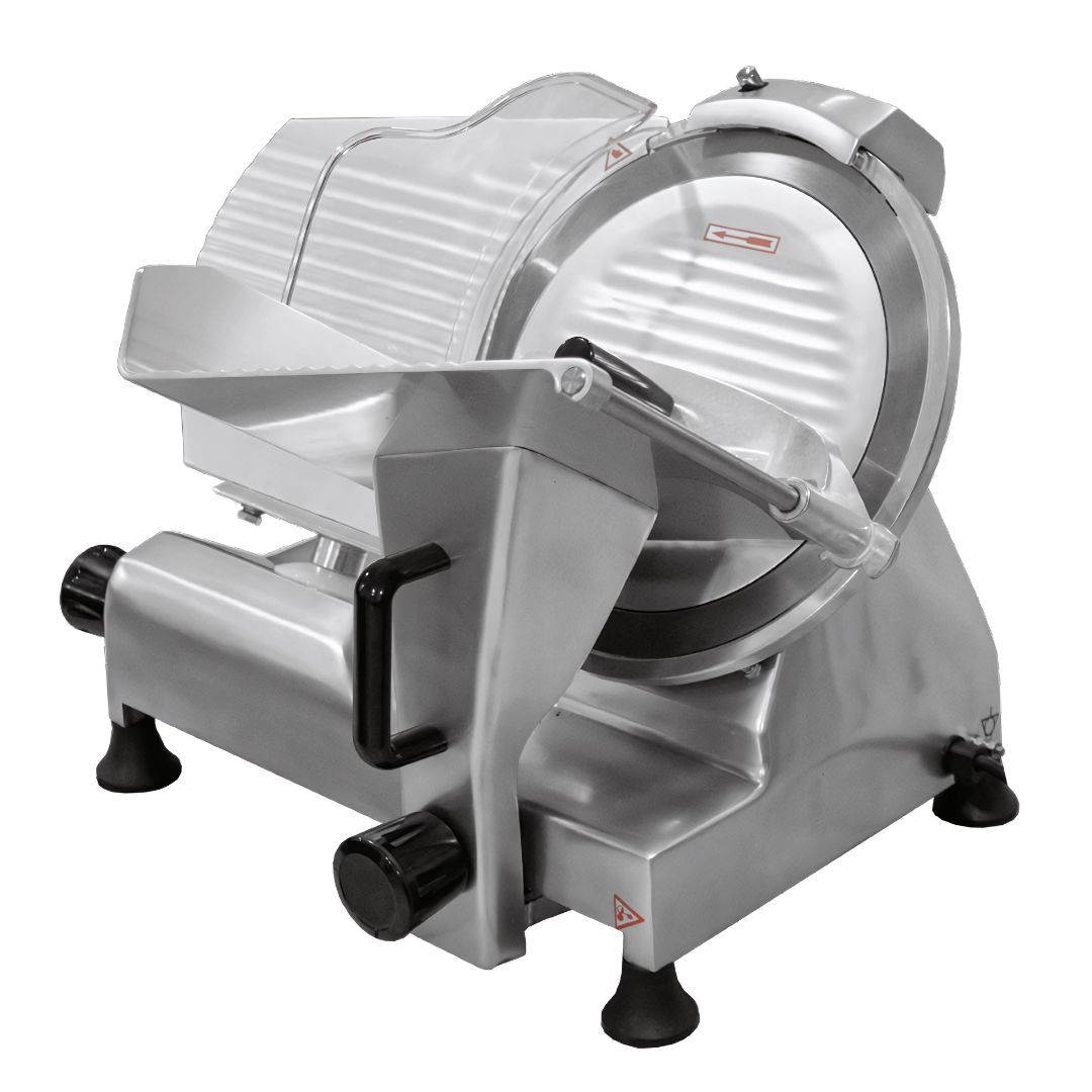 Rebanadora semiautomática con cuchilla de 300 mm, equipada con transmisión por banda para una operación silenciosa y eficiente. Su diseño inclinado a 45° facilita el corte por gravedad, reduciendo el esfuerzo del operador. Ideal para cortar jamón, queso, embutidos y carnes frías sin hueso.